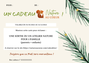 Pour Noël, offrez un cadeau original : un bon cadeau pour une sortie ou un atelier nature ! Nous proposons 3 types de bons cadeau :